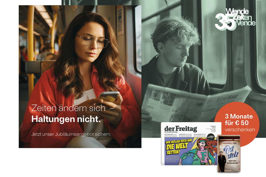 Seit 35 Jahren steht der Freitag für unabhängigen Qualitätsjournalismus mit Haltung. Feiern Sie mit uns dieses Jubiläum – und verschenken Sie kluge Perspektiven zum Aktionspreis.
