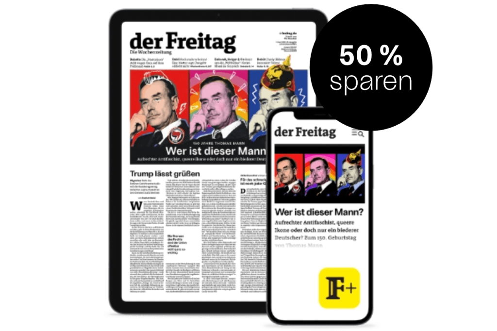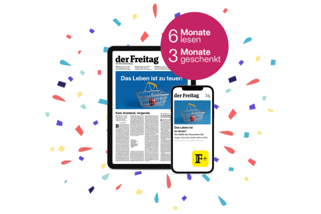 Lesen Sie jetzt den digitalen Freitag 6 Monate lang zum Aktionspreis und entdecken Sie die klügsten Positionen in unruhigen Zeiten.