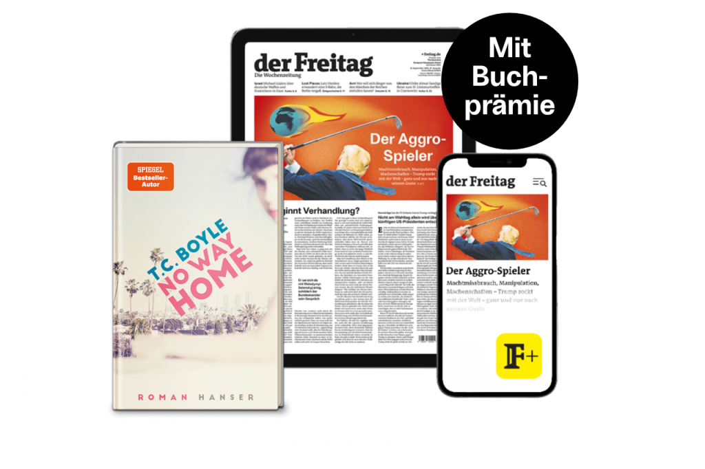 Lesen Sie jetzt 3 Monate lang täglich im Freitag digital die klügsten Stimmen zum aktuellen Weltgeschehen. Als exklusive Prämie erhalten Sie T.C. Boyles neuesten Roman „No Way Home“ gratis dazu.