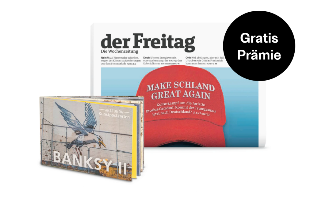 Verschenken Sie mit dem Freitag jede Woche kluge Analysen, klare Haltung und frische Perspektiven an Ihre Liebsten. Als Dankeschön bekommen Sie ein Banksy Postkartenset als Prämie gratis nach Hause geschickt.