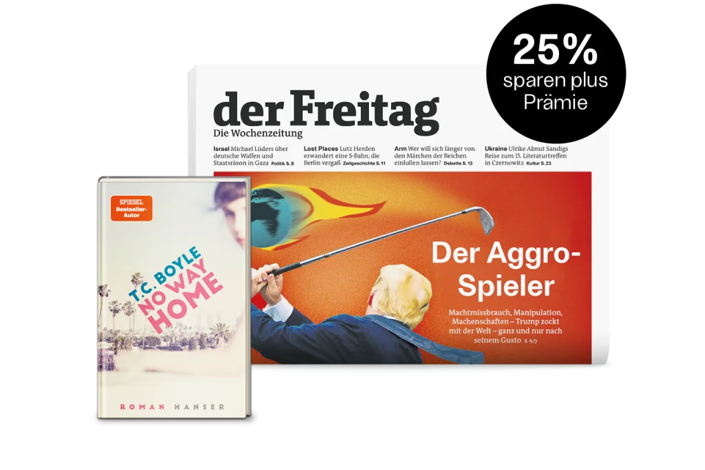 Verschenken Sie mit dem Freitag zwei Monate lang die klügsten Stimmen an Ihre Liebsten. Als Dankeschön erhalten Sie T.C. Boyles neuesten Roman „No Way Home“ gratis nach Hause geschickt.