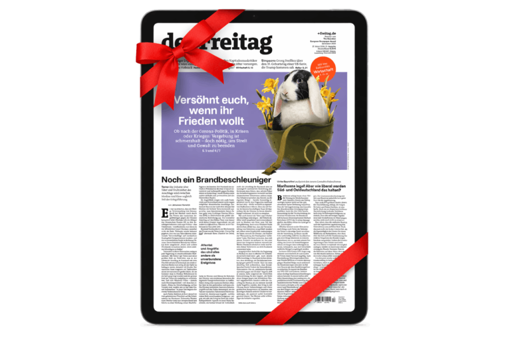 Verschenken Sie das komplette Digitalangebot des Freitag als Gutschein: 12 Monate zum Aktionspreis. Ohne Verpflichtung und Risiko – Laufzeit endet automatisch.