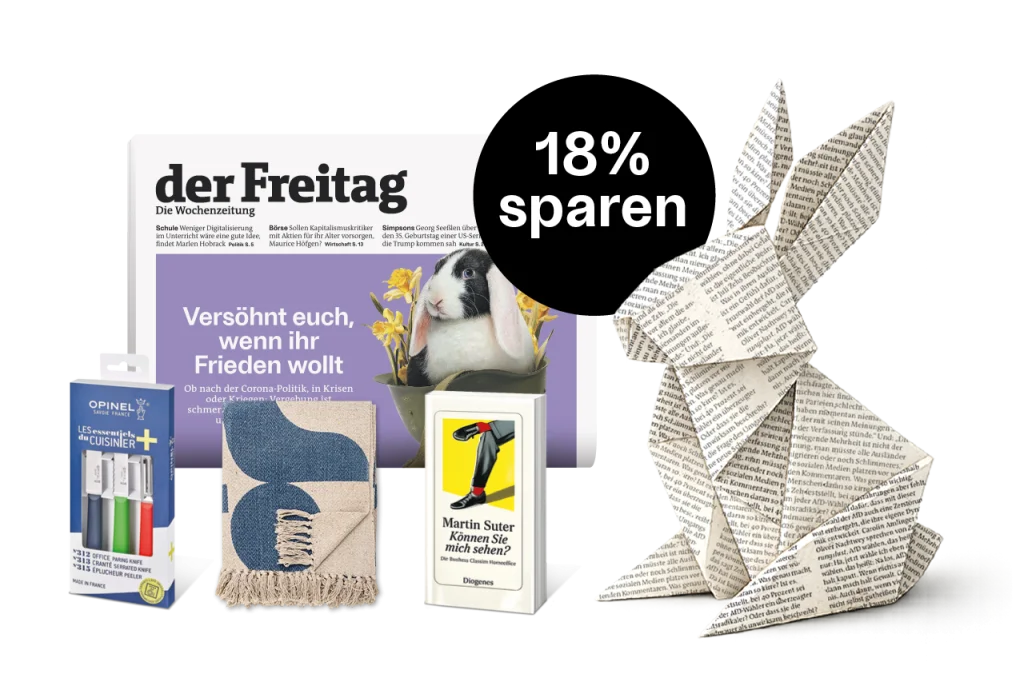 Ein Abo, das bleibt: Jetzt den Freitag für 6 oder 12 Monate lesen und über 25 % sparen. Als Dankeschön steht Ihnen eine Auswahl exklusiver Prämien zur Verfügung – wählen Sie Ihr Lieblingsgeschenk.